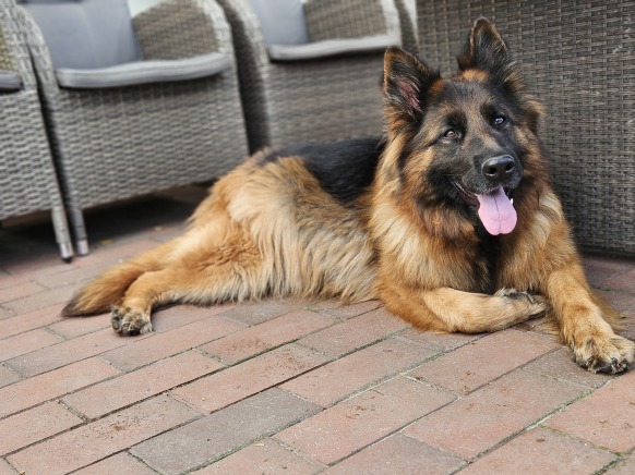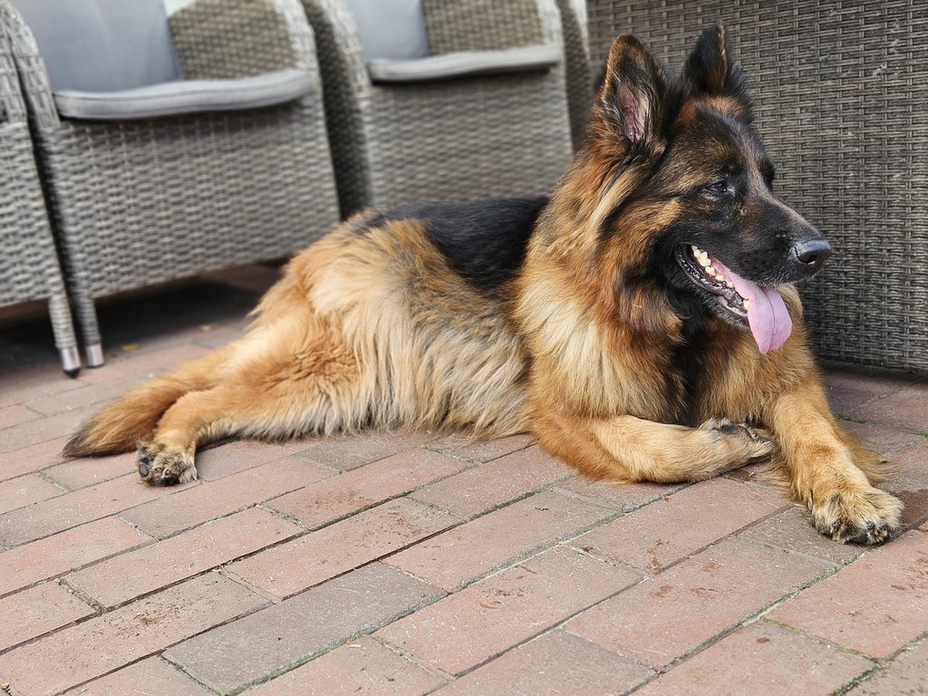 Ginny "Indira" ist eine wunderschöne schwarz/braune Altdeutsche Schäferhündin. Indira hat uns in den letzten Jahren immer wieder spitzen Welpen geschenkt. 2019 hatte sie ihren letzten Wurf und geht jetzt in ihr wohlverdientes Rentnerleben.